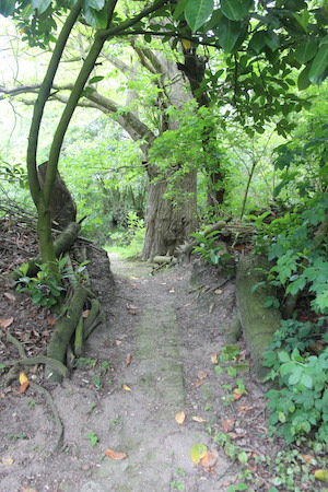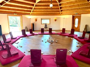 Achter de grote vijver staat onze Finse kota (110 m2), een cursusruimte die de droom is van iedere gever van opleidingen/cursussen: de perfecte vorm (achthoekig = praktisch rond), geheel gemaakt van natuurlijke materialen (Douglas dennenhout en lichte lemen wanden, eiken vloer), heerlijk gelijkmatig verwarmd door wandverwarming, heel goede geluidsinstallatie, bovendien gebouwd op een plek met een krachtige, warme energie. De ruimte is goed geisoleerd. Verschillende grote, ruwe brokken halfedelstenen vormen verlichtingselementen langs de wanden.